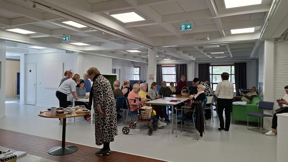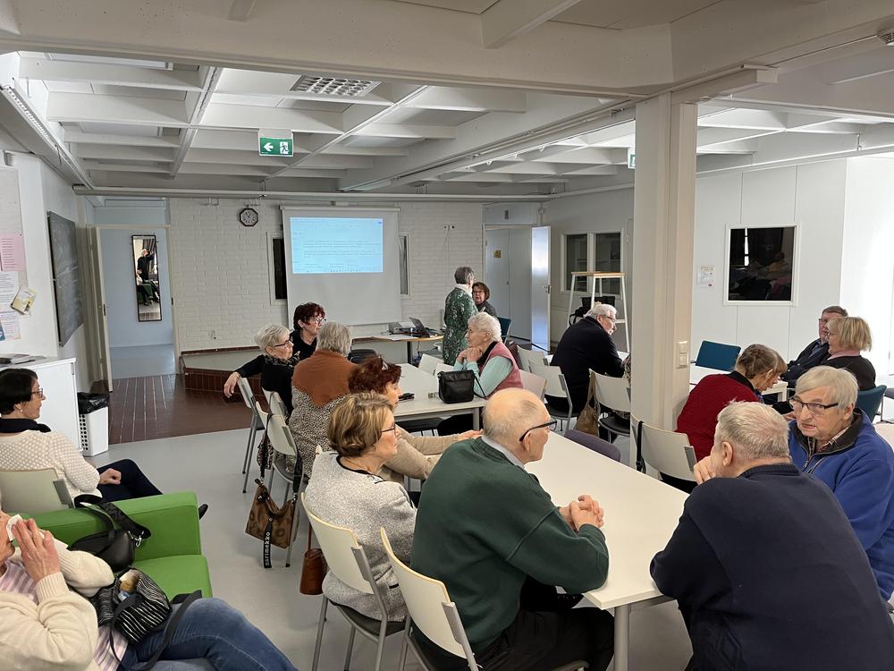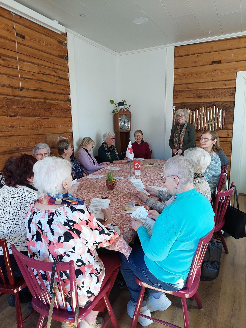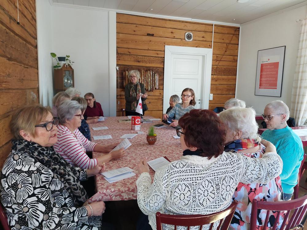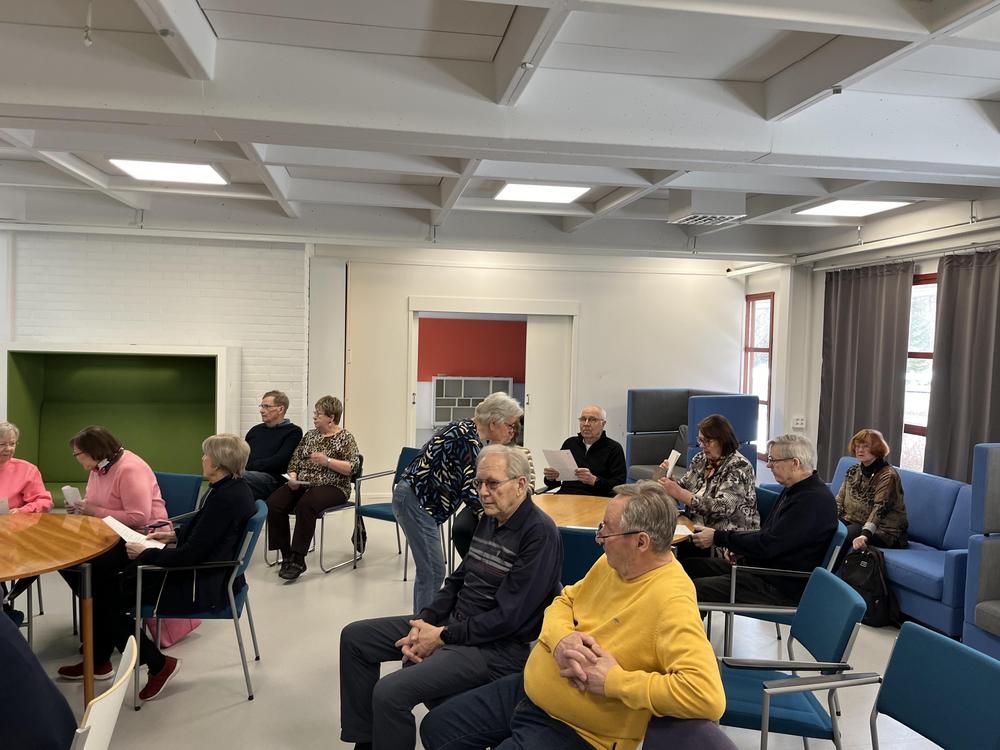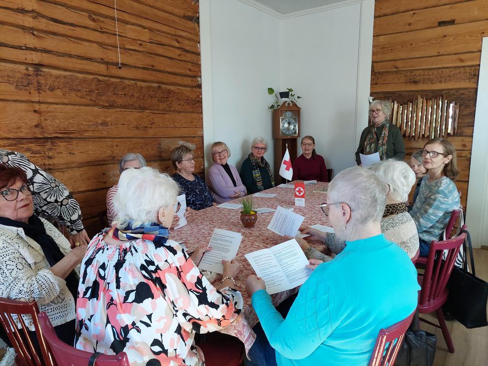 Kuvia jäsentapaamisesta 14.4.2026. Etualalla puheenjohtaja Marja-Leena Haimakainen.