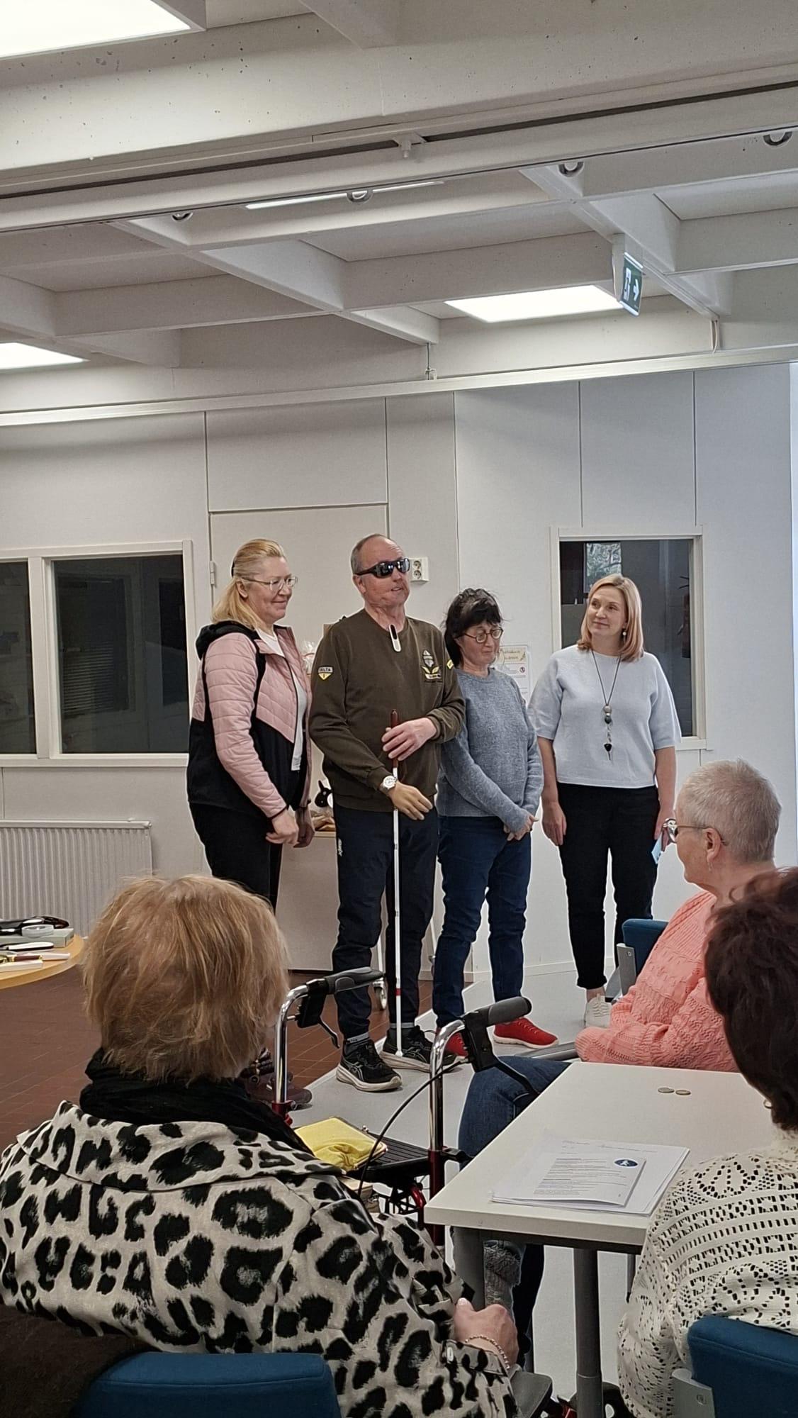 Huhtikuun kuukausitapaamisen vieraana oli Mäntän Seudun Näkövammaiset ry. Heidän puheenjohtaja Tero Ala-ajos ja sihteeri Mari Ojala kertoivat toiminnastaan paikkakunnalla. Kuvassa myös Saara Ahlrooth ja Elena Balode.