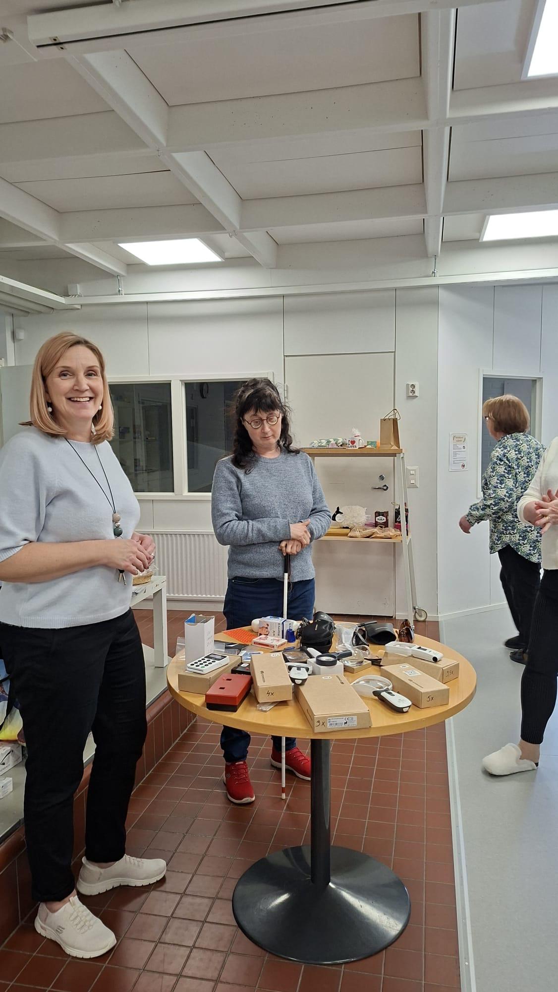 Tampereen seudun Näkövammaisista näkövammaistyön koordinaattori Saara Ahlroth ja Mäntän seudun Näkövammaisten sihteeri Mari Ojala esittelivät erilaisia apuvälineitä